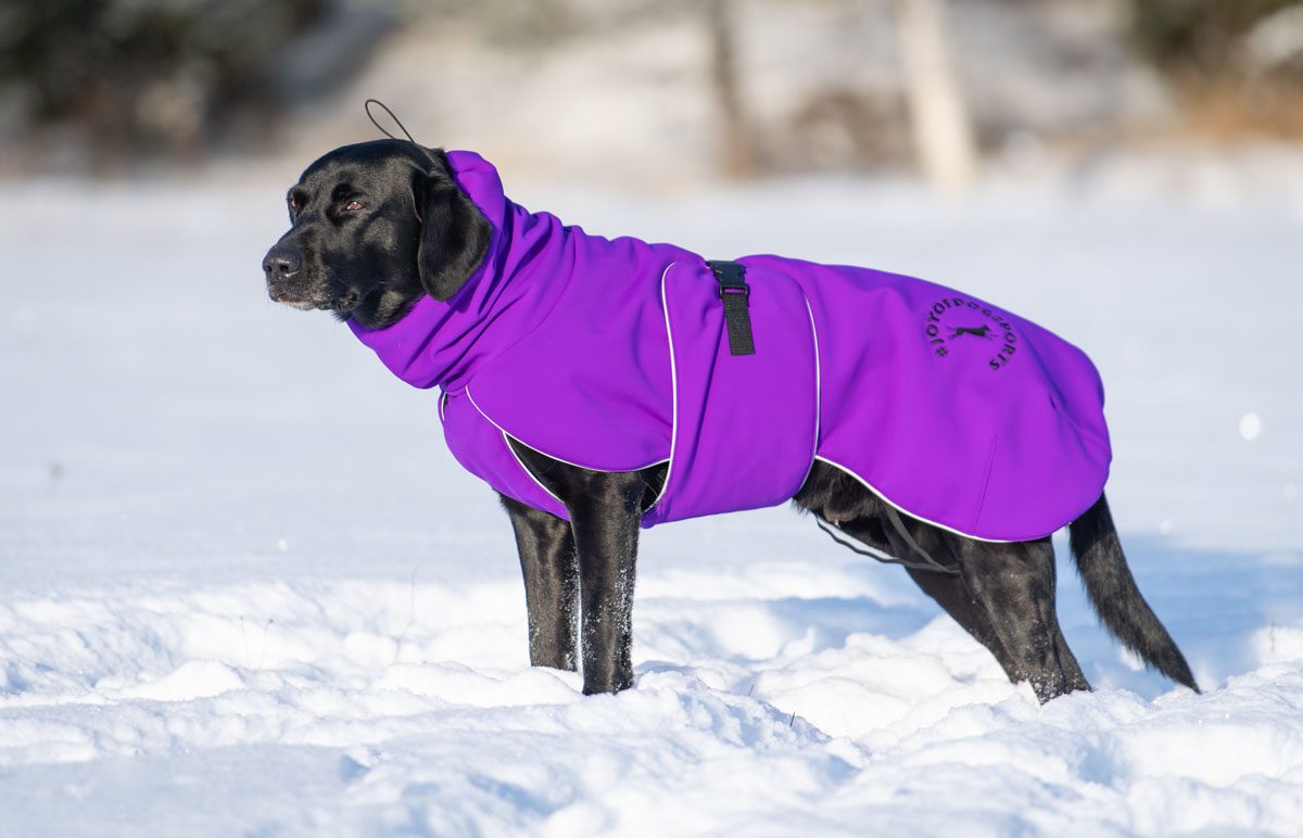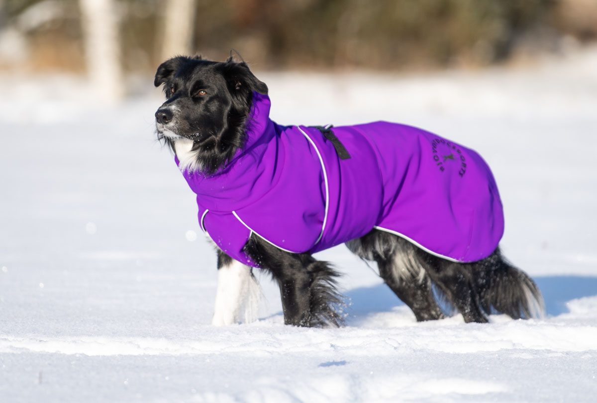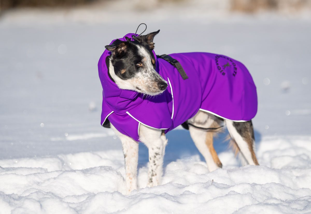 A premium jacket with a great design. Stays in place extremely well during every activity, even on my two very slim female Border Collies and even without the leg bands! The collar makes the jacket highly versatile and, most importantly, it keeps its wearer’s neck warm. The drawstring hood keeps snow from getting inside the collar, ensuring that the jacket stays dry and warm on long walks and on the car ride home. My dogs also seem happy with the jacket: it doesn’t crease or slide down one side, and it holds its place even when my dogs play with each other. The jacket’s design is really great for allowing natural movement because it doesn’t restrict movement in any way but still offers great coverage for the big muscles, keeping them nice and warm. Snow, water and dirt don’t seem to stick to or be absorbed by the surface material at all. A state-of-the-art product that I recommend warmly!
